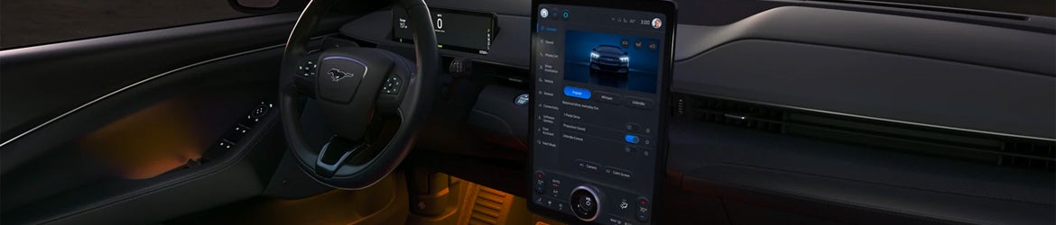 Inside the 2023 Mustang Mach-E is a sophisticated dashboard dominated by a 15.5" touchscreen display to cater to your infotainment needs. Comfort is never an issue with the Mustang Mach-E's seats, regardless of whether you opt for the standard or premium models with optional leather upholstery. Accommodating five passengers comfortably, it also has ample cargo space with a rear split folding seat configuration and an additional front trunk. The Mach-E also comes with advanced voice recognition technology.